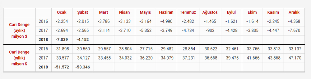 Cari işlemler dengesi, şubat ayında 4.15 milyar dolar açık verdi. Ekonomistler ortalama 4.3 milyar dolar ‘açık’ bekliyordu. Ocak-Şubat dönemi cari açık, 11.19 milyar dolar olurken, 12 aylık cari işlemler açığı 53.3 milyar dolar olarak gerçekleşti.Cari denge geçen yılın şubat ayında 2.57 milyar dolar, 2017’nin tamamında 47.17 milyar dolar açık vermişti.