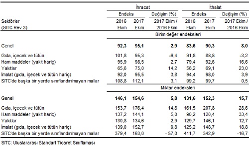 İhracat birim değer endeksi ekim ayında bir önceki yılın aynı ayına göre yüzde 2,9 arttı. Endeks bir önceki yılın aynı ayına göre, gıda, içecek ve tütünde yüzde 6,4 azalırken, ham maddelerde (yakıt hariç) yüzde 2,7, yakıtlarda yüzde 14,2 ve imalat sanayinde (gıda, içecek, tütün hariç) yüzde 3,8 arttı.