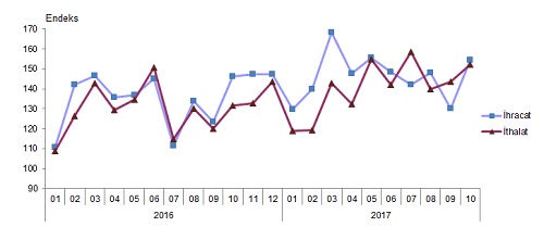 Mevsim ve takvim etkilerinden arındırılmış seriye göre; 2017 Eylül ayında 140,6 olan ihracat miktar endeksi yüzde 3,4 artarak, 2017 Ekim ayında 145,4 oldu. Takvim etkilerinden arındırılmış seriye göre ise; 2016 Ekim ayında 145,9 olan ihracat miktar endeksi yüzde 5,8 artarak, 2017 Ekim ayında 154,4 oldu.